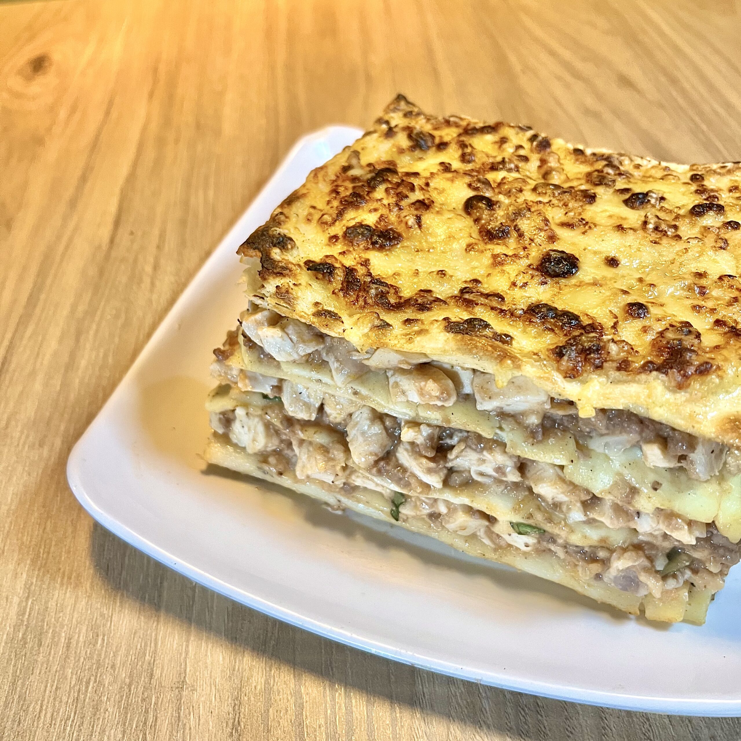 Pollo, napolitana, albahaca, bechamel, queso mozarella, especias y parmiggiano
