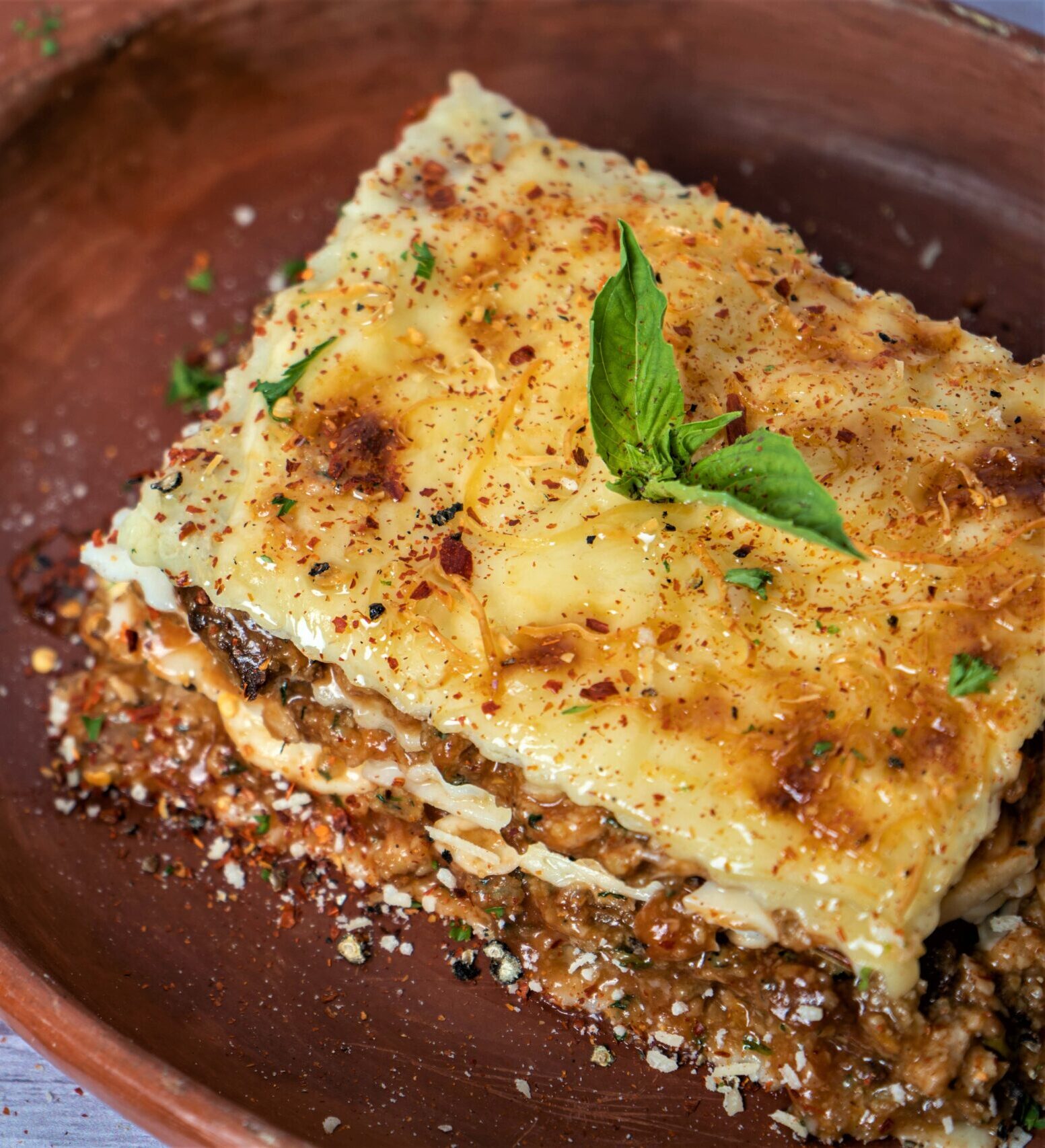 Carne, Pollo, napolitana, albahaca, bechamel, queso mozarella, especias y parmiggiano